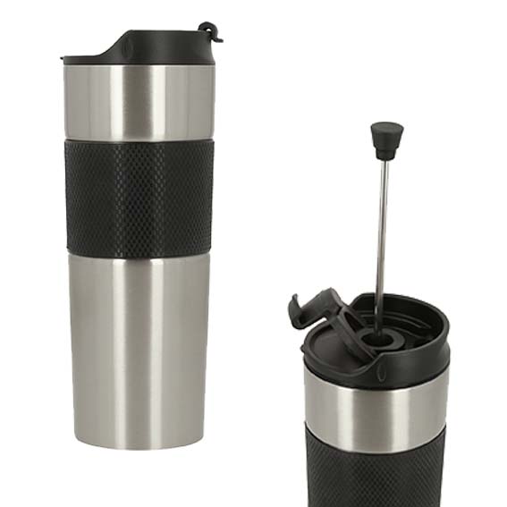 🏷️Descripción del producto | Termo de doble pared de acero inoxidable con prensa francesa, tapa hermética enroscable y manga de silicón. |